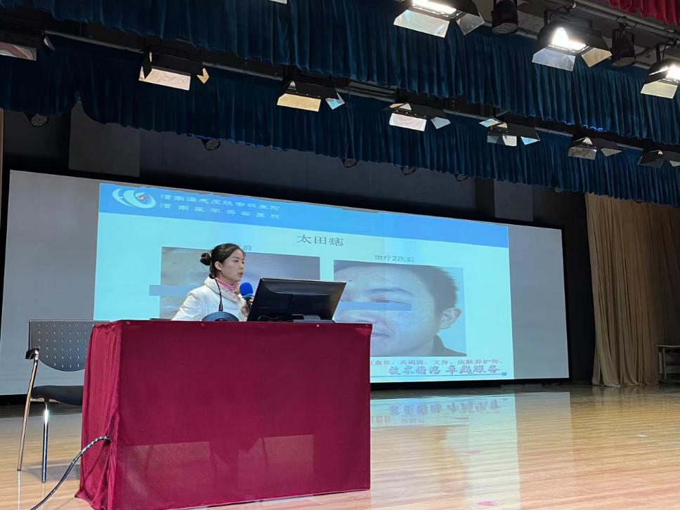 本次活动特约渭南海城皮肤病医院专家朱纪涛、雷丹两位主治医师作为主讲人,世界杯官网500余名师生参加了活动。讲座主要围绕青年皮肤常见问题、医美行业发展前景及就业状况、薪资待遇等方面讲解。同时就学生关心的痤疮产生的原因、日常护理、如何正确选择护肤品等内容进行了详细讲解。