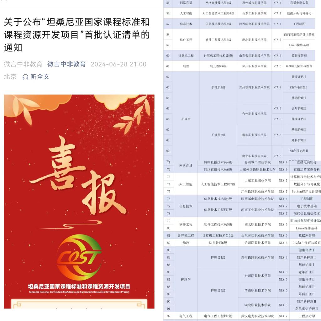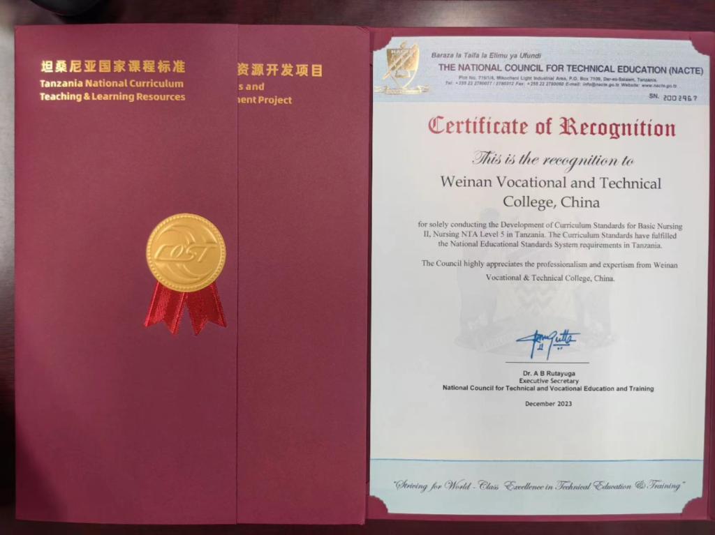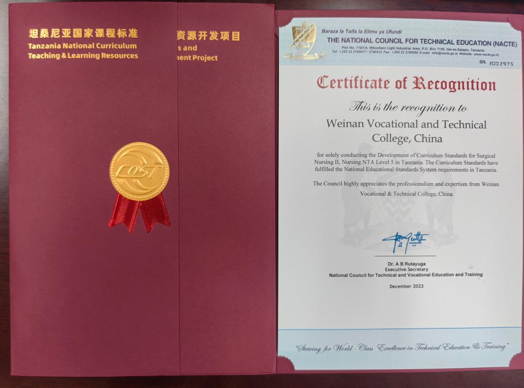 2023年9月中非职业教育联盟组织启动了“坦桑尼亚国家课程标准和课程资源开发项目”,世界杯官网护理专业NTA5级《护理学Ⅱ》和《外科护理学Ⅱ》两门课程积极申报立项。立项以来,学校领导高度重视,相关部门大力支持,世界杯官网与中非职业教育联盟紧密配合,课程负责人李丰收和席卫娟老师快速反应,组成合作项目课程小组,组织团队人员多次召开专题会议,各成员均具备高度负责态度,以扎实课程、充实内涵、为学校打响课程品牌为己任,团队人员先后研讨、撰写、修改、定稿,和合作方专家多次交流,历经三稿,完美完成本次对外课程输出项目。2门课程标准已被坦桑尼亚国家职业教育委员会审核认证,并签发认证函。