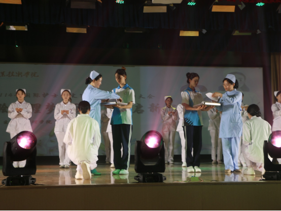 舞台光影交织,青春激情绽放。现代舞《Rotate》以机械齿轮般的精准联动开场,护生们化身跃动的生命齿轮,在疾速旋转中演绎急救室里的团队协作。古典舞《大鱼》翩然登场,水袖如涟漪般漾开,少女仿若游弋在生命之海的守护精灵,托举、旋腰间尽显护理专业的细腻柔情。茶艺展示《茶盏流云·锦心雅韵》将典礼推向雅致之境。一袭青衫的学子手持紫砂,行云流水间完成温杯、醒茶、凤凰三点头,茶匙与杯壁相触的清脆声响,恰似护理操作中的严谨章法。《世界赠与我》《成都》温暖旋律响起,将"被世界治愈,亦以温柔回馈"的护理哲思娓娓道来。
