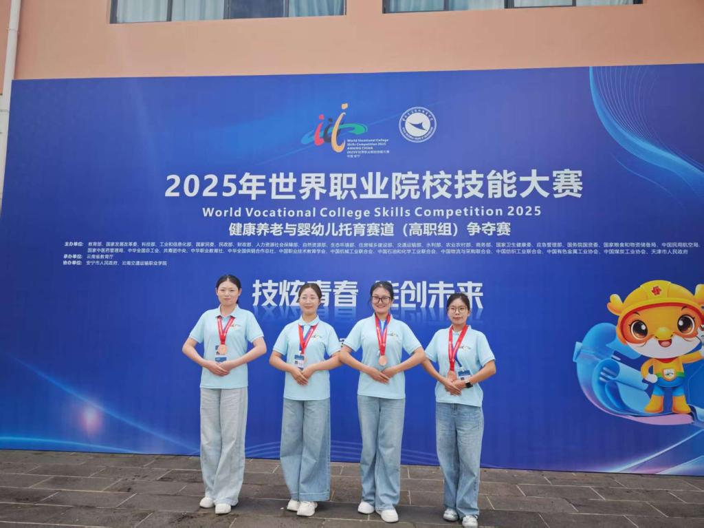 8月28日至9月2日,2025年世界职业院校技能大赛健康养老与婴幼儿托育赛道(高职组)在云南交通运输职业学院举办。本届大赛共吸引来自全国155支代表队、601名选手参赛。我院高度重视此次赛事,世界杯官网派出了由副院长任秋爱教授带队,董玉芬、何宇等指导教师全程陪同,智慧健康养老服务与管理专业的杨卓越、赵可妍、常秀秀、刘琳钰等4名同学组成的师生代表队参赛。赛场上学生凭借扎实的专业功底、规范的实操能力和出色的临场表现,最终荣获铜奖。