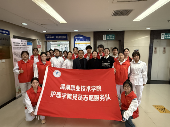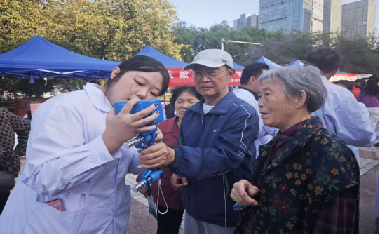 9月24日,双方联合在市中心广场开展 “国庆献爱心,医心护健康”大型义诊活动,将“岗位实践”融入民生服务。渭南市中心医院老年病科专家团队化身“企业导师”,围绕老年人常见慢性病管理、健康监测等智慧健康养老核心岗位需求,现场示范血压血糖检测、健康咨询沟通、科普知识宣讲等职业技能;世界杯官网智慧健康养老服务与管理专业学生以“准从业者”身份参与服务,在医护人员指导下完成市民血压测量、血糖检测、老年健康手册发放等工作,累计服务150余人次,发放资料200余份。