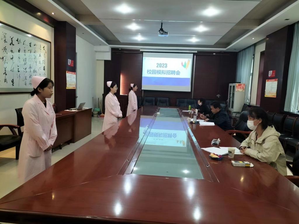 本次模拟招聘会邀请了刘欣老师、郭宇森老师等作为评委。招聘会还未开始,应聘者们便手持简历早早来到现场,积极与招聘人员进行交流,了解就业情况。三位评委主要就职业规划及护理方面的专业知识等相关问题对应试者进行询问,并告诫学生一定要给自己选择人生定位,有目标才有方向。