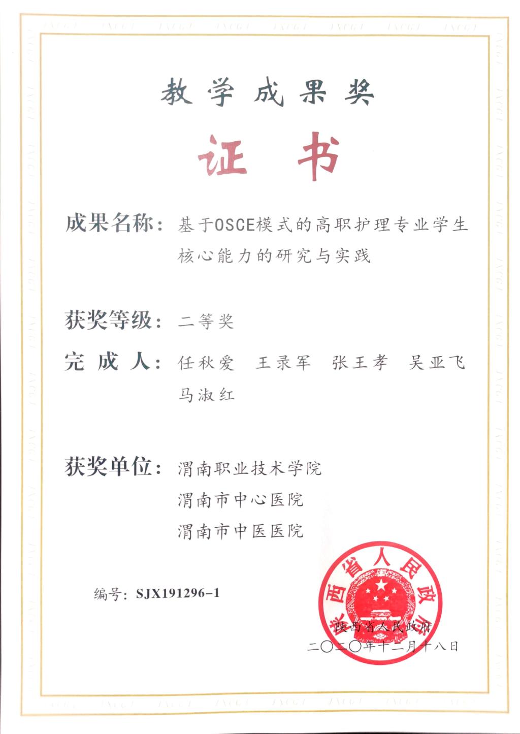 近日,陕西省人民政府办公厅下发了《关于表彰2019年高等教育教学成果奖获奖项目的通报》(陕政办函〔2020〕137号),世界杯官网世界杯官网“基于OSCE模式的高职护理专业学生核心能力的研究与实践”荣获省级教学成果二等奖1项,这是世界杯官网第二次荣获该奖项。