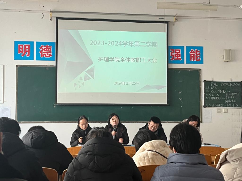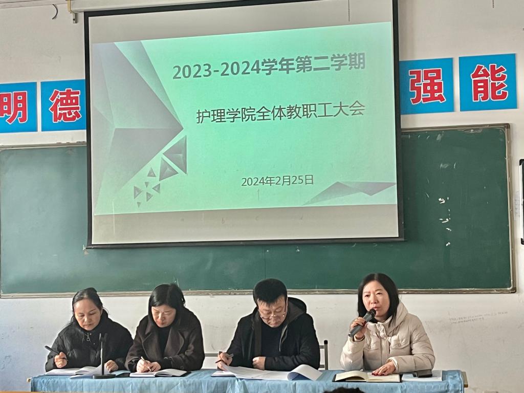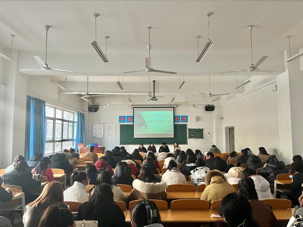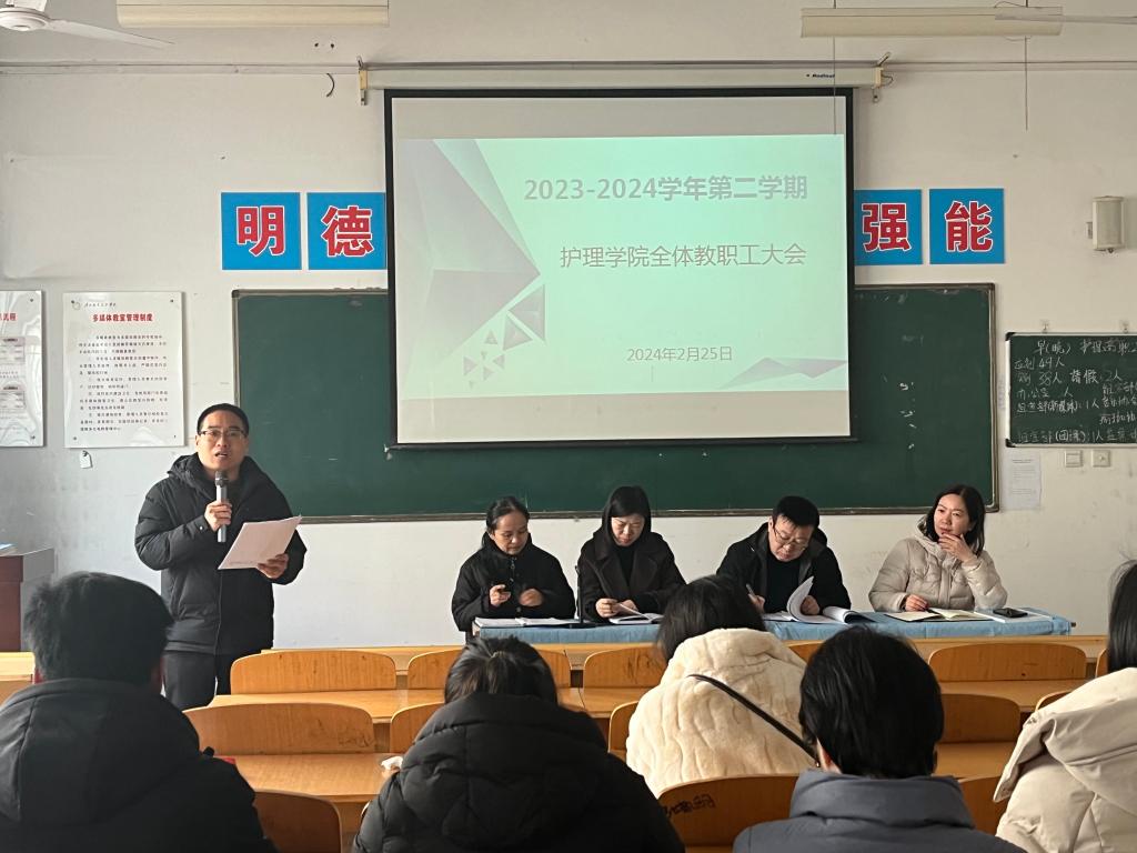 为确保开学之后的各项工作平稳有序开展,2月25日上午,世界杯官网院长张成、副院长吴亚飞,党总支副书记周梦花、招生就业科科长何宇及全体教职工齐聚公共教学楼南楼102教室,召开2024年春季开学教职工大会。会议由世界杯官网副院长任秋爱主持。
