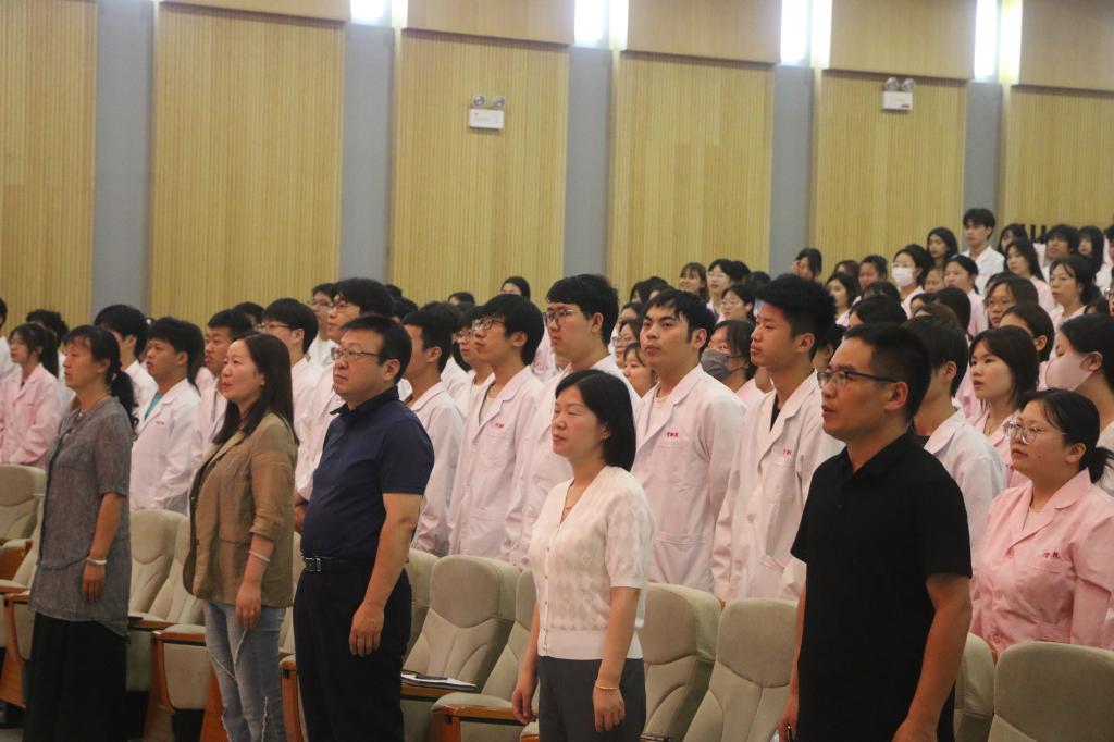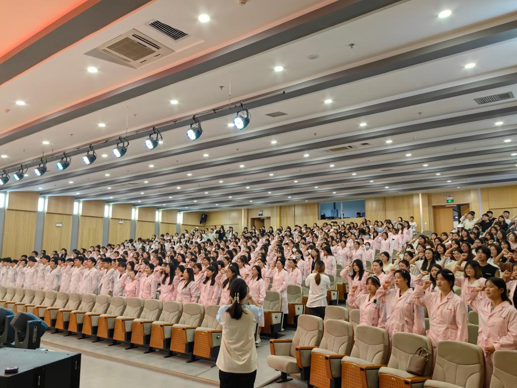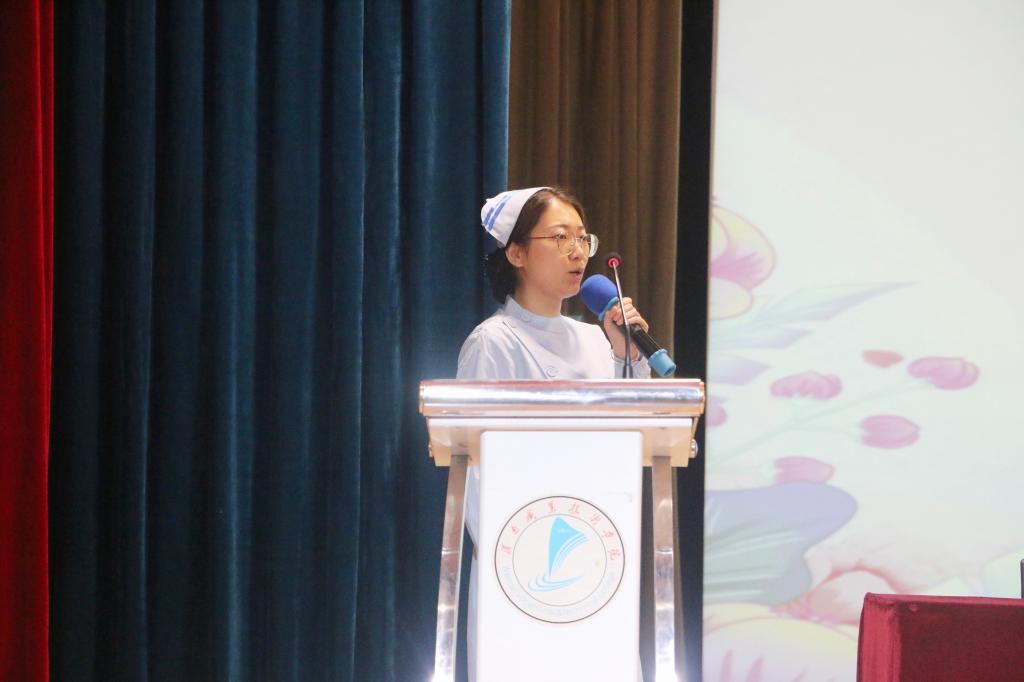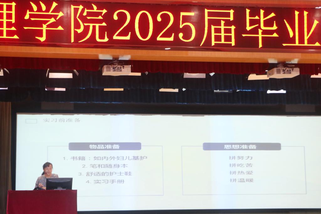 会议在全体参会师生齐唱国歌的庄严氛围中拉开帷幕。吴亚飞向同学们详细解读了《中华人民共和国职业教育法》《高等职业学校普通护理专业顶岗实习标准》《职业学校学生实习管理规定》等文件中关于实习的相关规定,结合真实案例进行了分析,使学生从国家法律和规定层面认识到实习的重要性和严肃性。刘欣为学生讲解了实习流程和实习考核手册的填写要求。周梦花向学生强调了实习期间的人身和财产安全问题。何宇带领大家一起学习了当前就业形势,号召学生在完成实习任务的同时,积累求职和工作经验,为将来就业打下坚实基础。赵国辉为学生讲解了征兵的条件、工作流程和各项征兵政策,希望同学们积极踊跃报名参军,为国防添彩,让青春出彩。张成做了实习总动员,他希望同学们实习前做好充分的思想准备,尽快完成角色转换,在实践中锤炼吃苦耐劳的优良品质,脚踏实地完成实习任务,同时强调要时刻将实习安全放在首要位置。全体护生在白聪聪老师的带领下重温了南丁格尔誓言。孙会娟对会议做了总结,她希望全体护生能不忘初心,谨遵誓言,在未来的岗位上德技并修,怀揣爱心、真心和同情心为患者提供最佳服务。