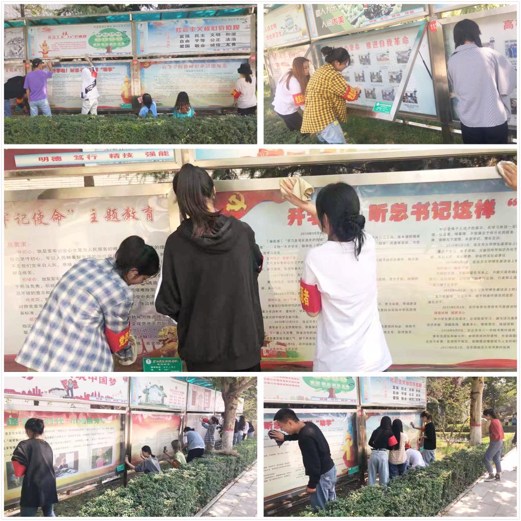 宣传设施是现代宣传工作的重要组成部分,是展现学校价值观念、师生风貌、校园精神文化的重要载体。在国庆节到来之际,我院学生党支部40余名积极分子向优秀党员学习,发扬吃苦耐劳精神,提起水桶,拿上抹布,对新校区宣传栏进行了护理清洁。