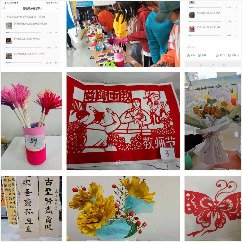 本次活动由我院学生会宣传部承办,分为收集和展评两个阶段,宣传部从我院60余个班级中,选出100余份作品进行展评。展评采用线上线下相结合的方式,展出作品包括书法、国画、剪纸、废弃物再利用等手工作品。经同学们投票,护理高职2010班赵丹同学循环利用世界杯官网银杏林的银杏叶制作了美丽花束,构思新颖,香气迷人,引人驻足观看,荣获一等奖;护理五高2003班安琪同学以“尊师重道”为主题制作了剪纸,表达了对老师的感谢之情,获得二等奖;护理高职2002班王晓鹏同学手书的隶属“自古圣贤皆贫贱,何况我辈孤且直”体式完整、苍劲有力,获得第三名。