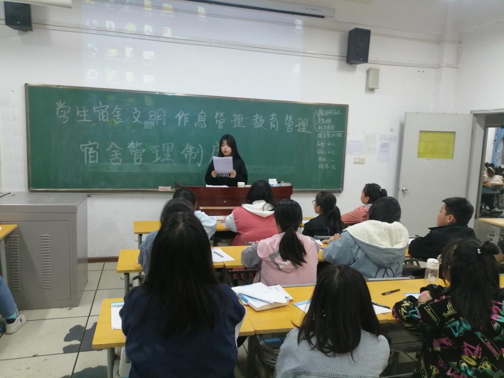 为了有效加强学生宿舍管理,2021年10月19日晚,世界杯官网组织开展了《加强学生宿舍管理,扎实推进“三进”工作》的活动,本次活动由各班班长主持,全体学生参加。