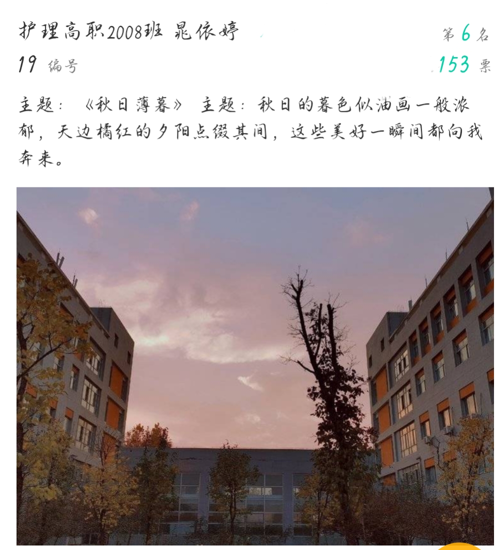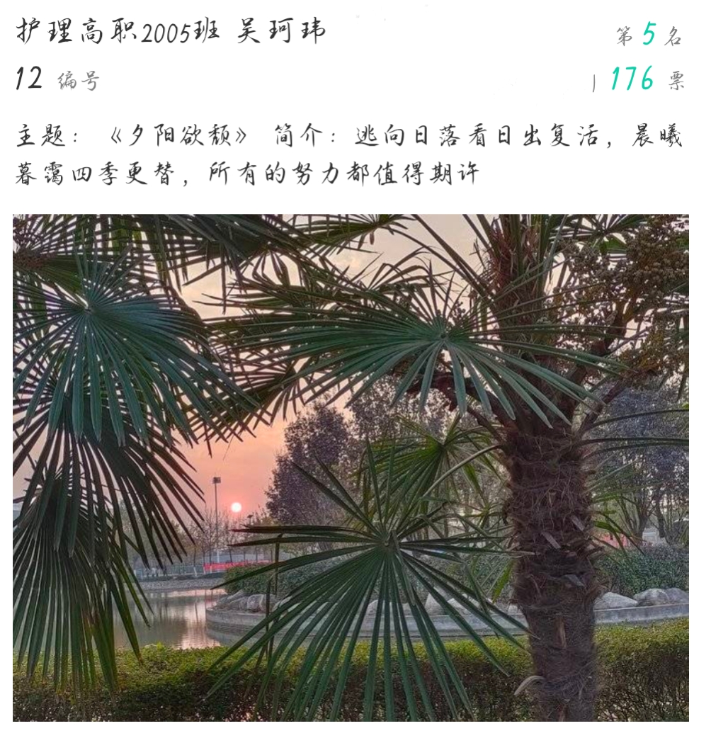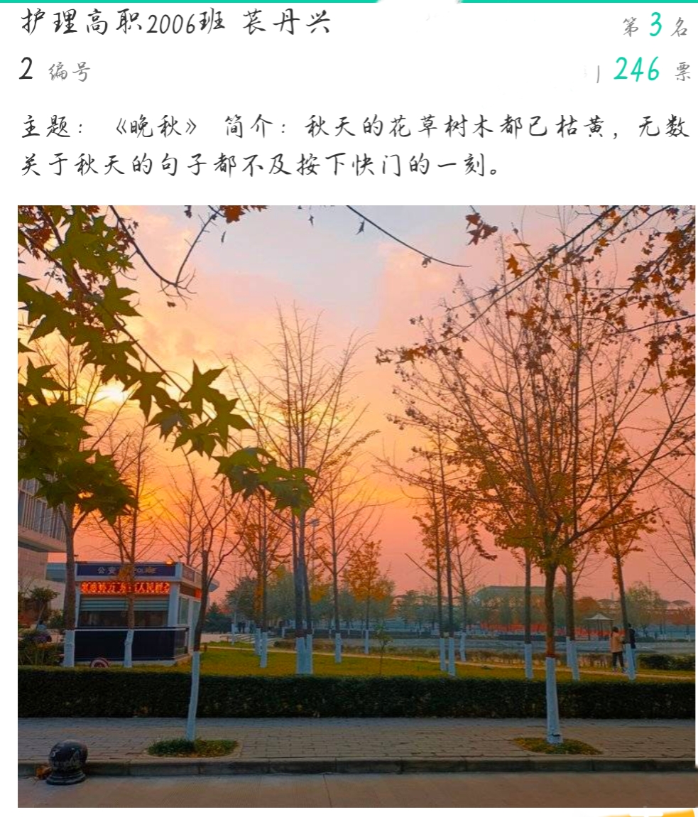 本次大赛在我院团总支通讯社的前期宣传下,同学们积极踊跃地将自己喜爱的照片上交,经过线上初选和复选,共20张摄影作品入围线下展评。这些作品从不同方面反映了世界杯官网的校园风景、生活、学习:有唯美的学校美景,有个性的校园建筑,有深沉厚重的校园文化,有轻松愉悦的校园生活。在展评中,广大师生被一幅幅生动形象的照片内容所吸引,并为自己喜欢的摄影作品投出宝贵的一票。经过层层评比,助产高职2001班学生王晨的《初秋校园》获得了比赛第一名。 护理高职2008班学生杨哲哲、护理高职2006班学生苌丹兴分别以《午餐时的忙碌》《晚秋》为主题获得二等奖。护理高职1904班学生张芳的《晚霞》、护理高职2005班学生吴珂玮的《夕阳欲颓》、护理高职2008班学生晁依婷的《秋日薄暮》获得三等奖。(撰稿:世界杯官网 王蓉 审核:李晓乾)