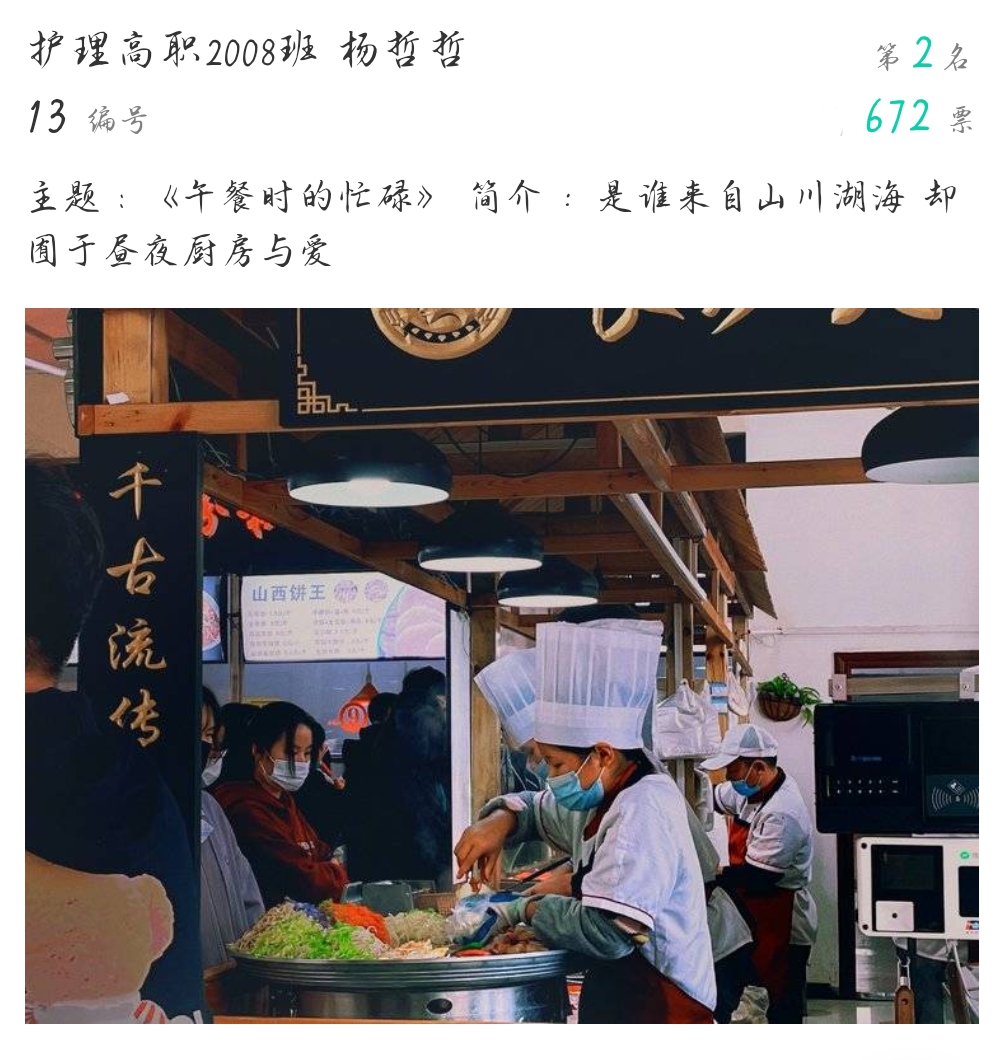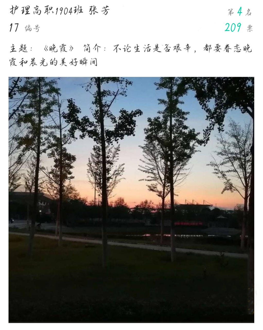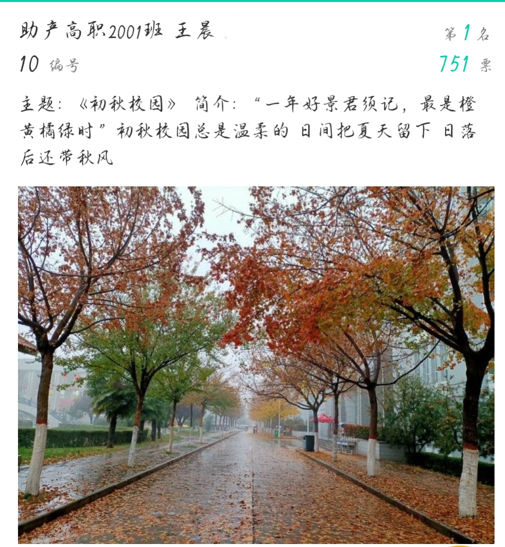 本次大赛在我院团总支通讯社的前期宣传下,同学们积极踊跃地将自己喜爱的照片上交,经过线上初选和复选,共20张摄影作品入围线下展评。这些作品从不同方面反映了世界杯官网的校园风景、生活、学习:有唯美的学校美景,有个性的校园建筑,有深沉厚重的校园文化,有轻松愉悦的校园生活。在展评中,广大师生被一幅幅生动形象的照片内容所吸引,并为自己喜欢的摄影作品投出宝贵的一票。经过层层评比,助产高职2001班学生王晨的《初秋校园》获得了比赛第一名。 护理高职2008班学生杨哲哲、护理高职2006班学生苌丹兴分别以《午餐时的忙碌》《晚秋》为主题获得二等奖。护理高职1904班学生张芳的《晚霞》、护理高职2005班学生吴珂玮的《夕阳欲颓》、护理高职2008班学生晁依婷的《秋日薄暮》获得三等奖。(撰稿:世界杯官网 王蓉 审核:李晓乾)