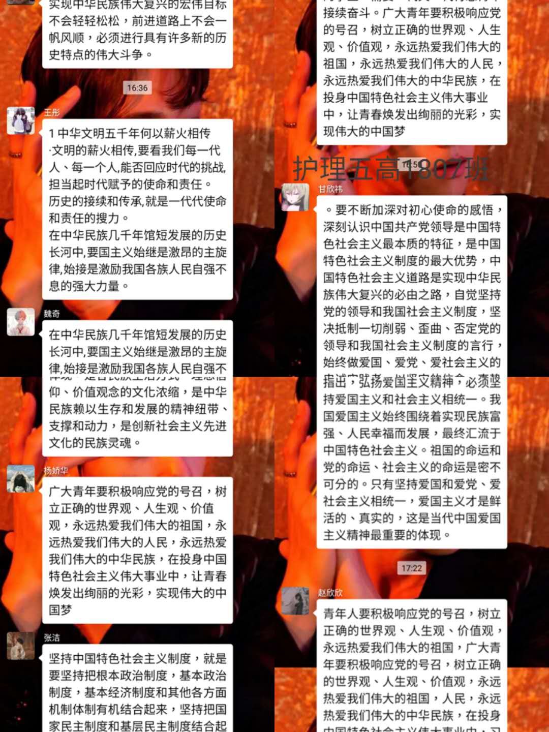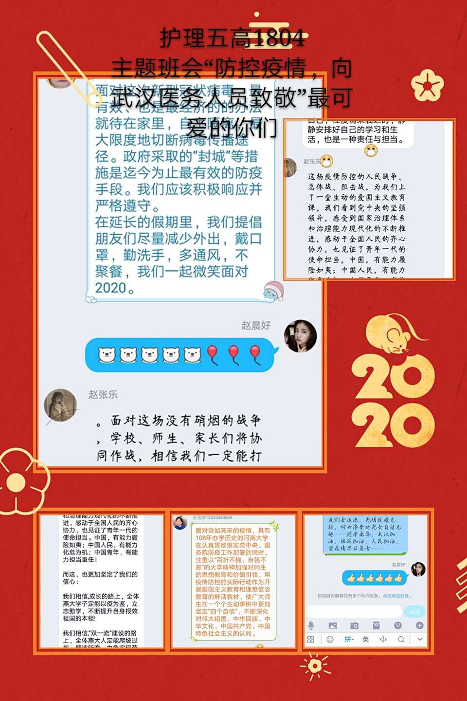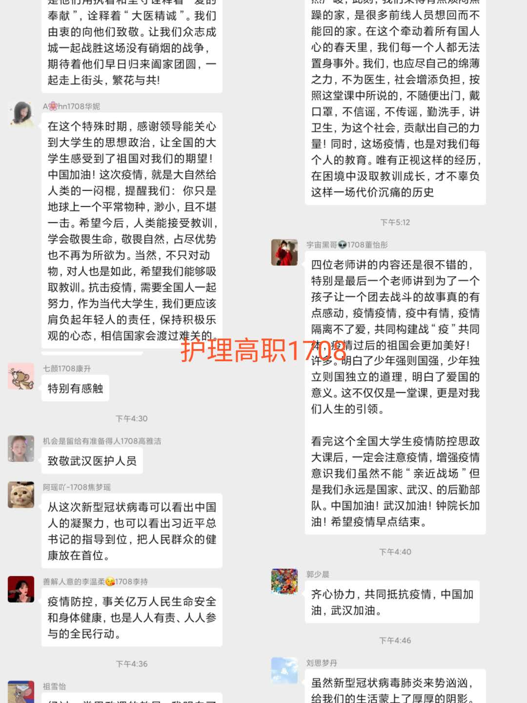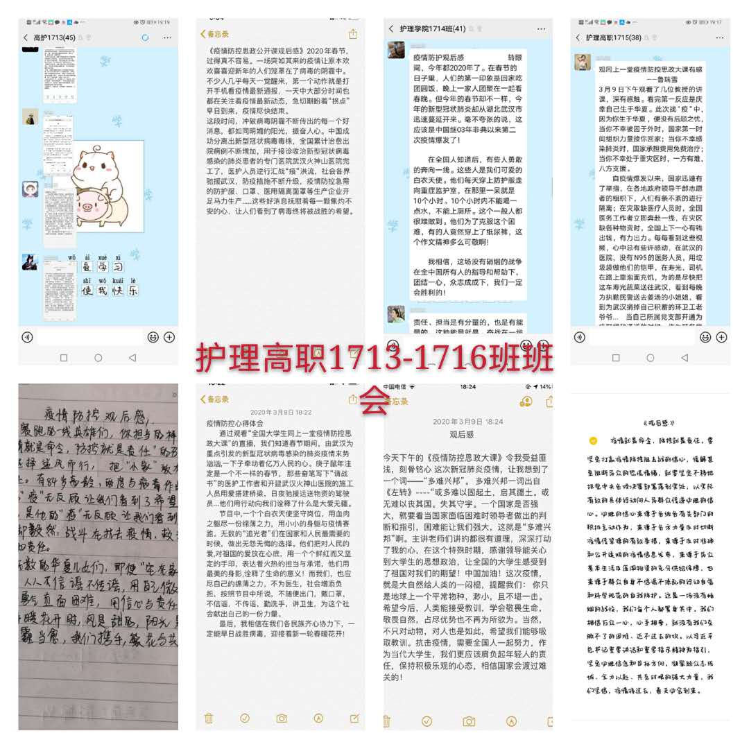 观看结束后,我院学生以班级为单位,在学管人员的指导下,开展了线上主题班会。师生们结合学科专业特点展开了讨论。世界杯官网党总支书记吴运胜认为:“对于世界杯官网的师生来说,这次思想政治教育课安排得很及时。在这场战‘疫’中,党和政府从历史中总结经验,担起人类命运共同体的责任,用‘武汉封城’的强大魄力,向世界彰显了中国共产党领导和中国特色社会主义制度的显著优势。作为党的教育工作者,我们要积极教育引导广大学生,坚定在以习近平同志为核心的党中央坚强领导下打赢这场疫情防控人民战、总体战、阻击战的信心和决心。”党总支副书记马淑红认为:“课堂中的战疫小故事,让我们看到了当代青年的大勇、大我和大德,我们要积极宣传学生身边的榜样事迹,继续引导广大青年学生勇担使命,积极奉献社会,为实现中华民族的伟大复兴梦而奋斗。”学生科科长李博认为:“这堂公开课兼具思想高度和理论深度,有数据有实例,有情感有温度,进一步增强了大学生的‘四个自信’,激发大学生的爱国热情和创新创业的动力。”护理高职1804班学生王晔在班会中说:“作为一名00后护生,我们要牢记医学生誓言和南丁格尔誓言,向奔赴疫情前线的前辈学习,做到胸有大志、心有大我、肩有重任、行有大德,用实际行动谱写自己大写的青春。”(撰稿:世界杯官网 王蓉 审核:李晓乾)
