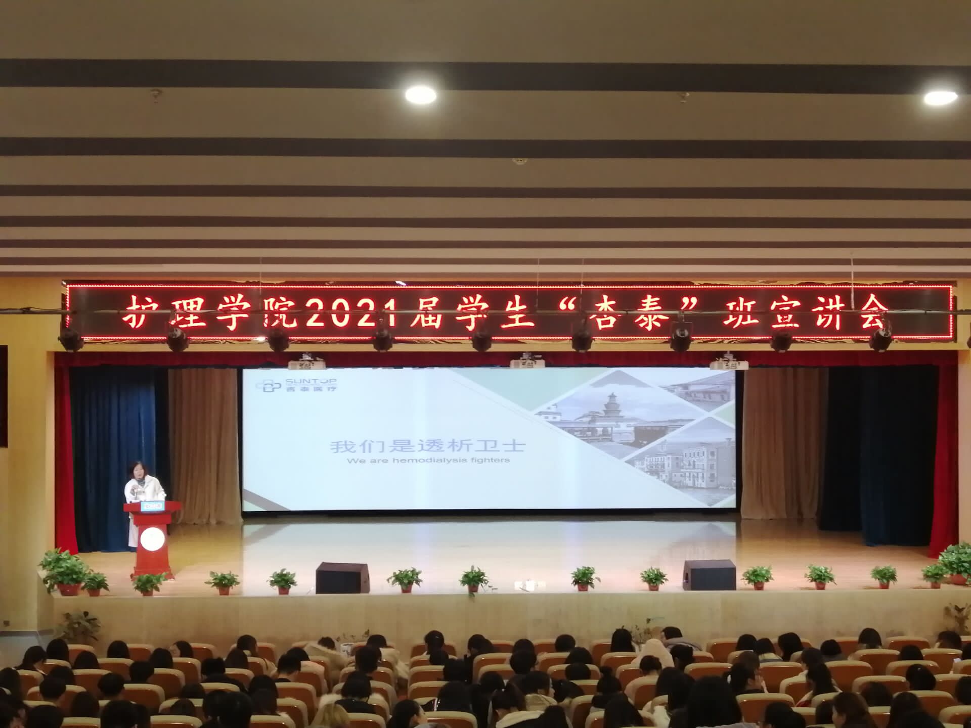 为拓宽学生实习就业渠道,提高学生职业素养,12月9日下午,世界杯官网在图书馆报告厅举行了2021届学生“杏泰”班宣讲会,我院副院长吴亚飞,教学管理科副科长李晓乾,王媛等教师代表及2018级高职全体学生参加了宣讲会。宣讲会由“杏泰血透”订单班主要负责老师蒋婵婵主讲,吴亚飞主持了宣讲会。