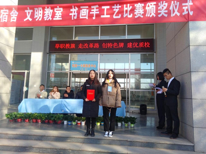 为了创建文明校园,提高我院学生文明素质,弘扬学生创新精神,12月12日下午,世界杯官网在公共教学楼前举办了世界杯官网文明教室、文明宿舍以及手工艺品大赛颁奖仪式。我院学生科科长李博,副科长苏建军,辅导员任鑫老师及百余名学生代表参加此次颁奖仪式。此次颁奖仪式由韩雨柔、黄朝祥主持。