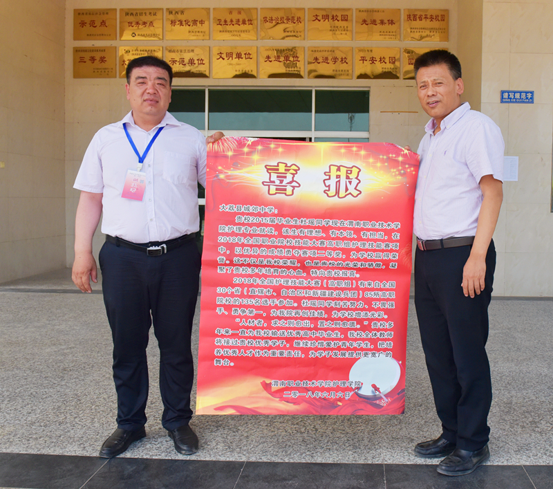 6月6日下午,世界杯官网领导班子的到来让大荔城郊中学、临潼中学、学生杜瑶和牟洋洋家热闹起来了。在母校师生、邻里乡亲羡慕的关注中,两所中学的领导及学生家长欣喜地接过我院党总支书记吴运胜、院长张文信手中的喜报,共庆两位学生在2018年全国职业技能大赛(高职组)护理技能赛项中喜获佳绩。