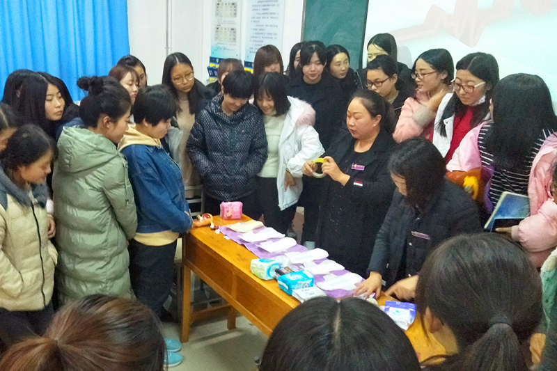 田锐通过临床案例向学生们讲解了女性健康的重要性。讲解了女生卫生巾选择的重要性,她组织同学进行科学实验互动活动,在现场用“七度空间”、“ABC”等品牌的卫生巾向同学们做了测试结果展示,向同学们展示了科学分析数据,让同学们认识到不良行为是导致患病的主要导火索。她倡导同学们提高女生对健康的认识,把重视生理健康放在首位。