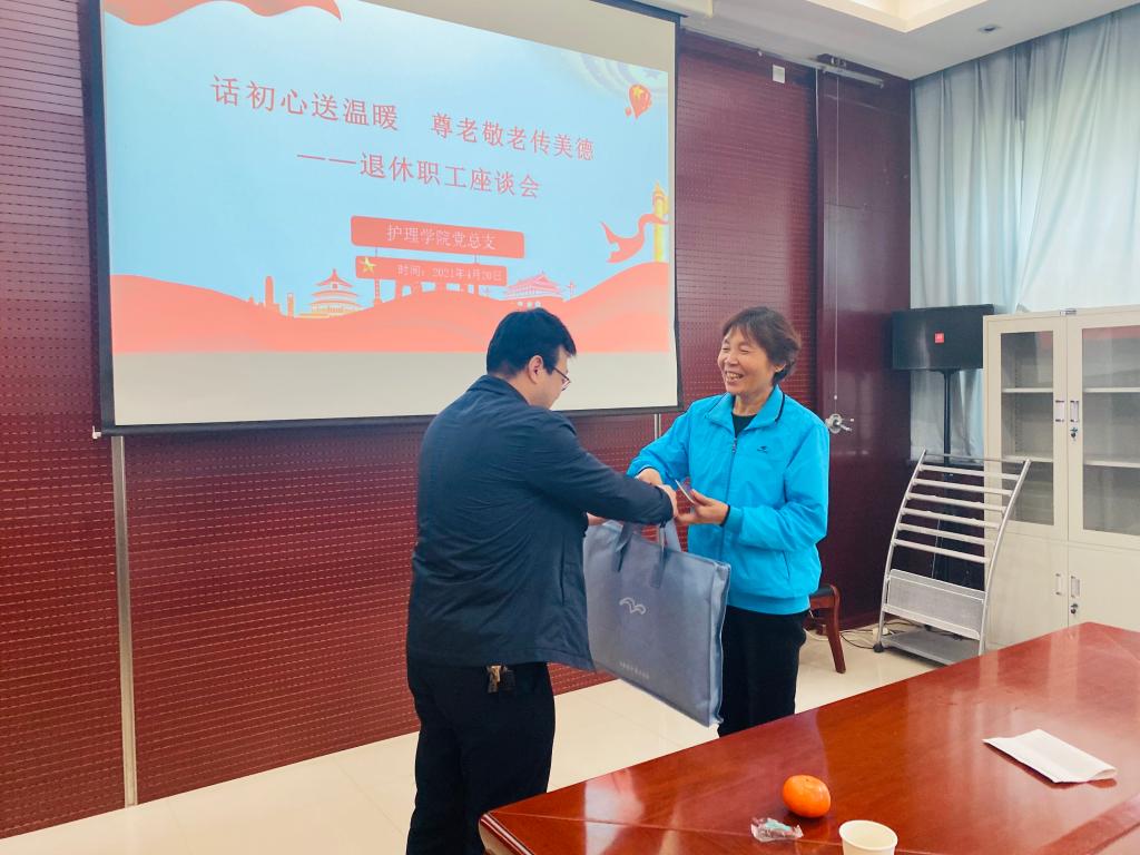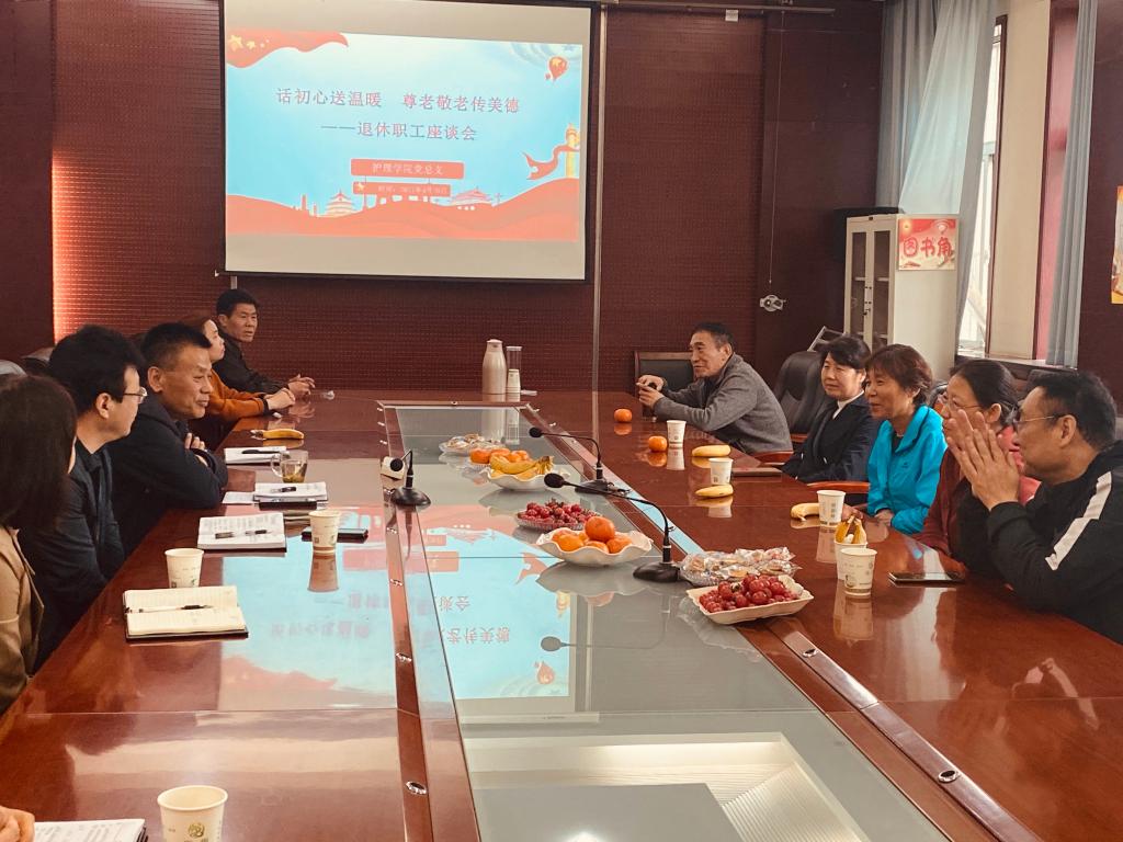 4月20日上午,世界杯官网在医训楼第一会议室召开了以“话初心送温暖,尊老敬老传美德”为主题的退休职工座谈会。我院党总支书记吴运胜、院长张成、副院长吴亚飞、任秋爱、副书记李晓乾以及教学科、学生科部分同志与年内退休职工参加。