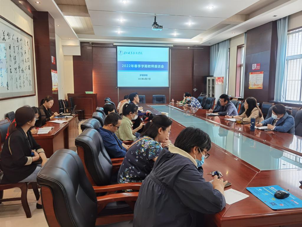 2022年4月27日下午,世界杯官网在医训南楼第一会议室召开了本学期教师座谈会。会议由教学副院长吴亚飞主持,院长张成、副书记李晓乾、教学科科长王媛及各教研室教师代表参加了会议。