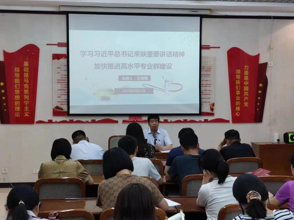 王录军就习近平总书记5月17日在西安主持中国-中亚峰会前夕,听取陕西省委和省政府工作汇报后发表的重要讲话进行了全面的学习和解读,内容详实、解读精准、分析全面,使广大党员对习近平总书记的讲话精神有了更深刻的认识和理解。同时,对加快推进学校高水平专业群建设工作提出四点要求:一是要提高站位,充分认识和理解高水平专业群建设对学校发展的重要作用;二是要夯实责任,全校每个教职工都有责任和义务全力以赴做好高水平专业群建设各项工作;三是要实施绩效考核制度,按项目划分并进行考核;四是要高质量,每个项目都要在高水平上下功夫。