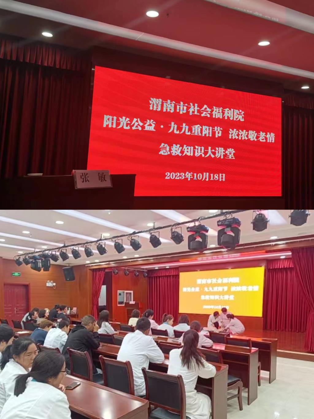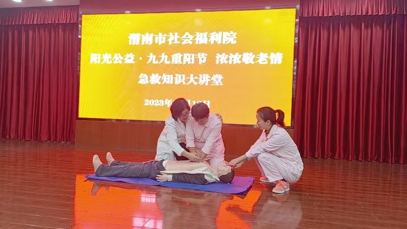 为弘扬敬老爱老的优良传统,丰富辖区老年人的精神文化生活,在九九重阳节来临之际,受渭南市社会福利院邀请,世界杯官网世界杯官网教师张敏参加了“阳光公益·九九重阳节 浓浓敬老情急救知识”大讲堂活动,助力我院双高建设。她通过“心脏骤停的患者如何做心肺复苏?气道异物梗阻的患者如何救护?”等两部分为大家详细介绍了如何判断心脏骤停,心脏骤停后的胸外按压、开放气道、人工呼吸等方法及气道异物梗阻的原因、表现、海姆立克急救法的原理、操作方法等。为了让大家更好的掌握这些知识,让护理员切身体验操作的方法,张敏在现场给予详细、耐心的实操指导。