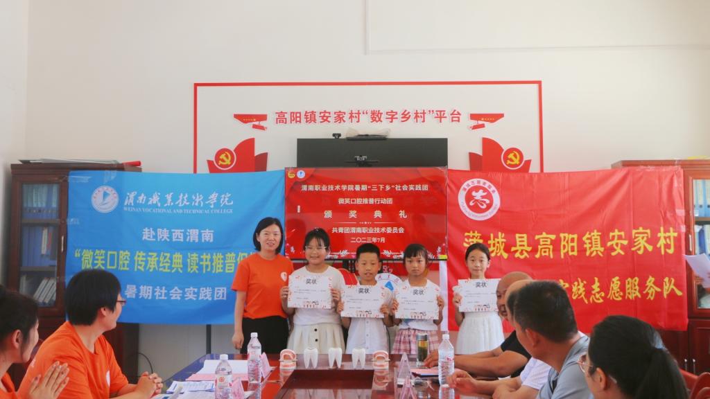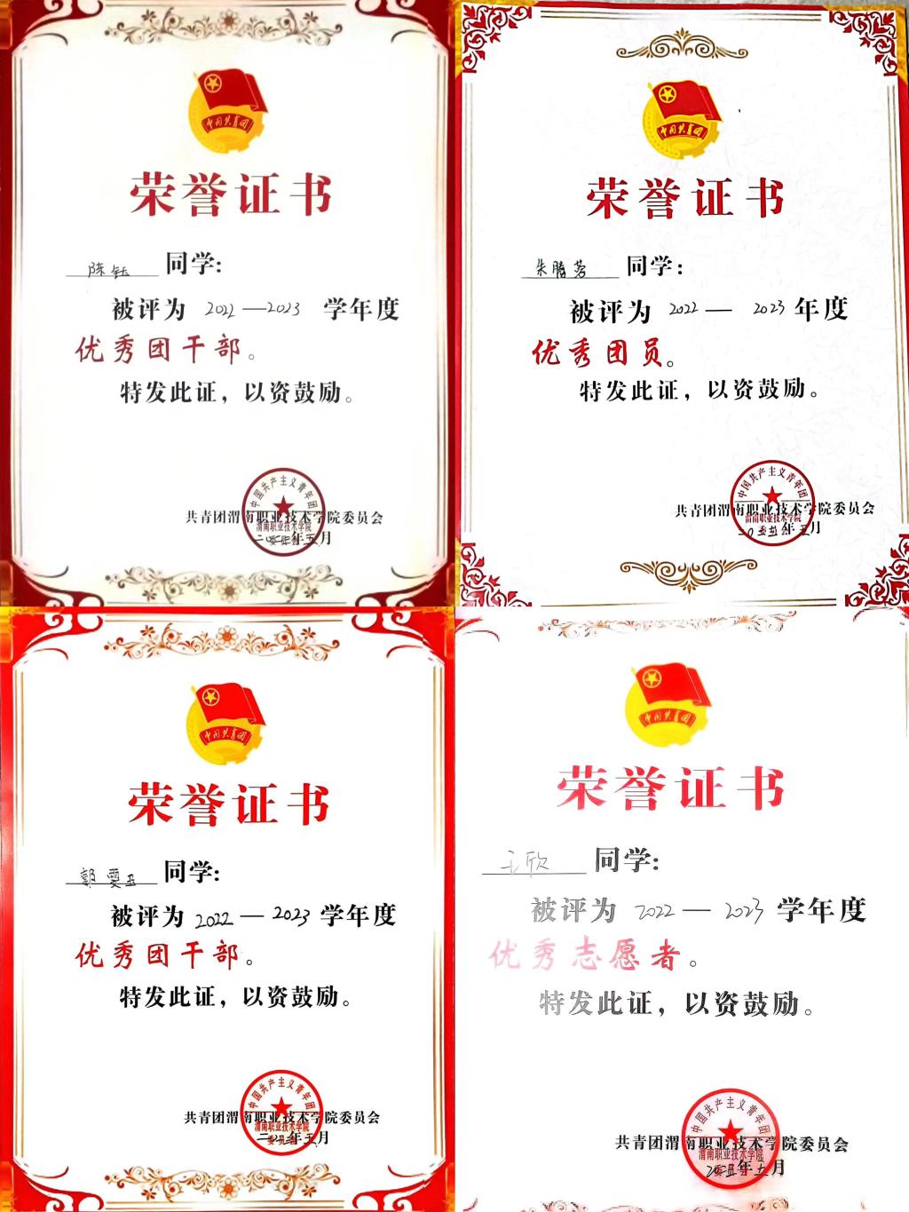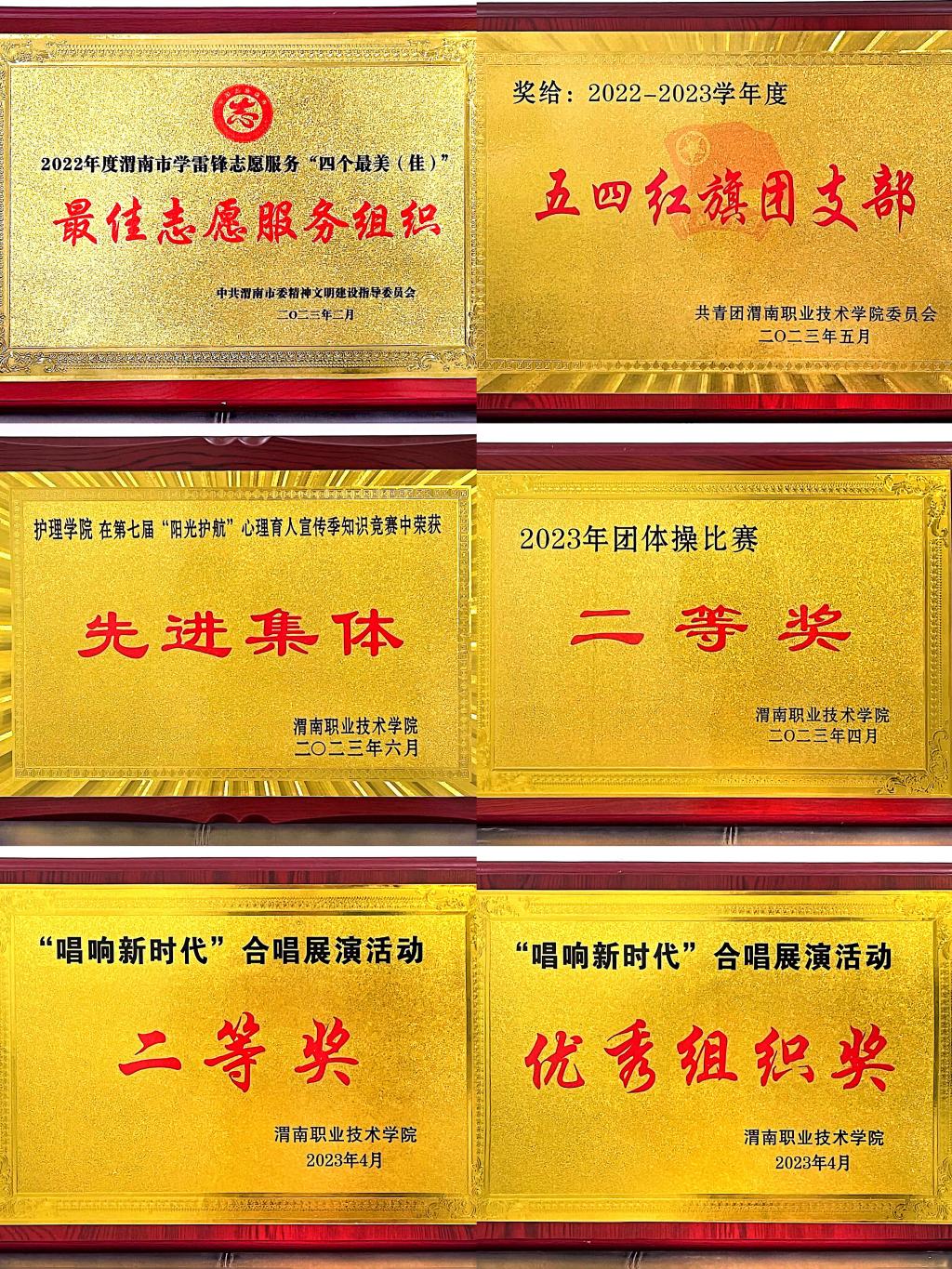 世界杯官网团总支被中共渭南市委精神文明建设指导委员会评为“最佳志愿服务组织”,被共青团渭南市委评为“渭南市五四红旗团支部(团总支)。护理高职2203班团支部等6个团支部获“五四红旗团支部”,郭瑞等47名师生获“优秀团干部”称号,张岚等100名同学获“优秀团员”称号,孙佳乐等14名同学获“优秀青年志愿者”称号。