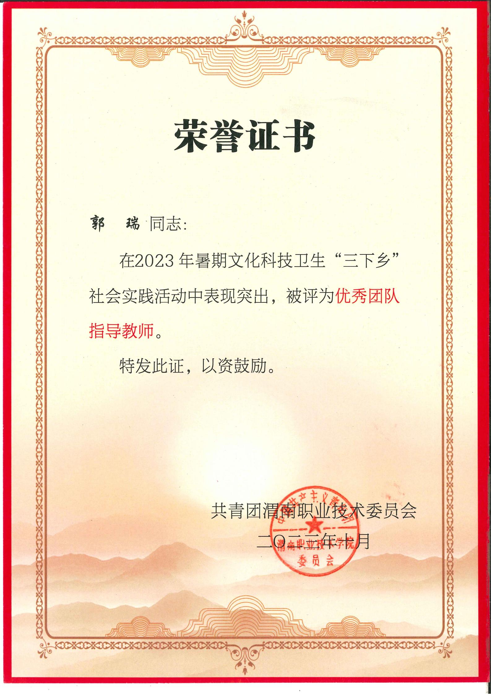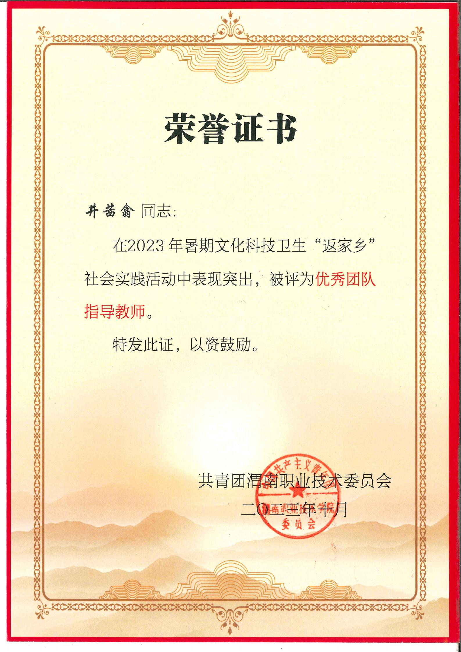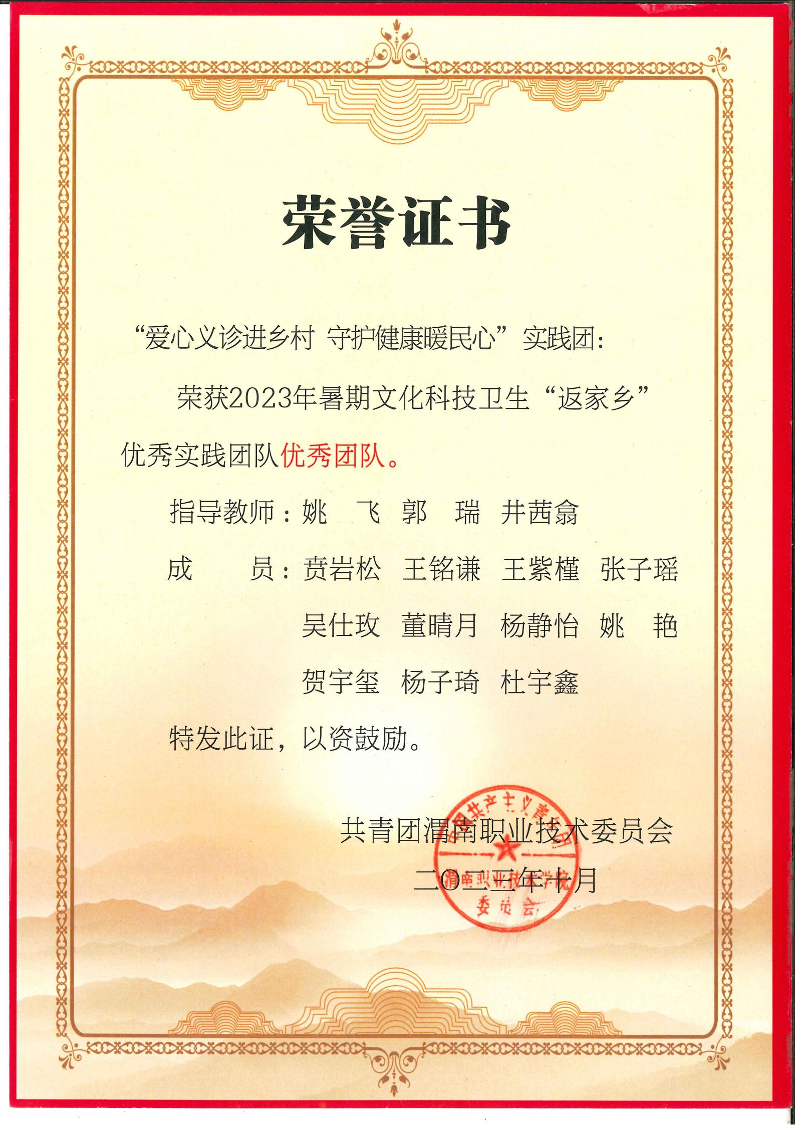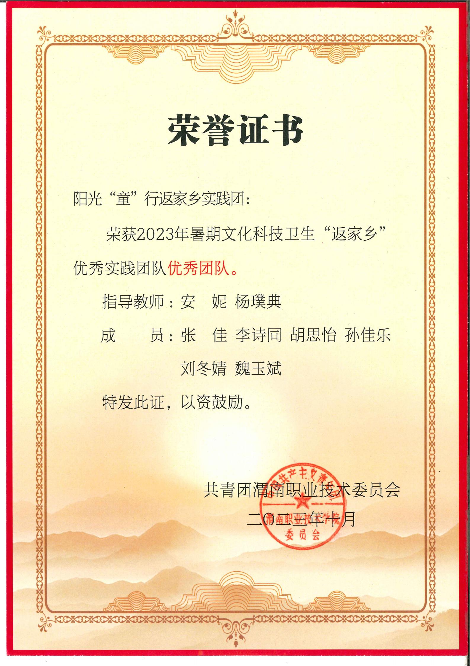 开展暑期文化科技卫生“三下乡”社会实践活动,申报项目7个,获奖5个,2名指导老师被评为优秀指导教师,2名学生被评为“实践优秀标兵”,获“先进集体”称号。