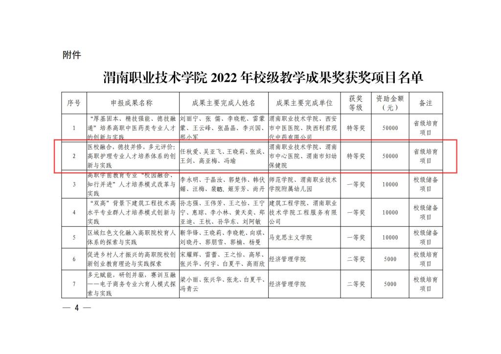 (1)获校级教学成果特等奖1项,并申报了省级教学成果奖:《医校整合,德技并修,多元评价:高职护理专业人才培养体系的创新与实践》。